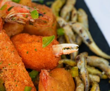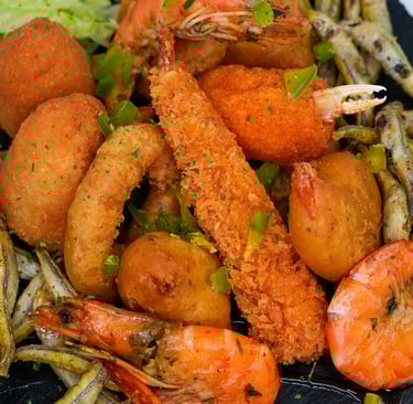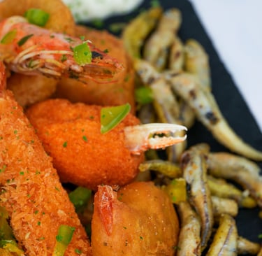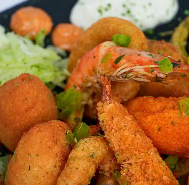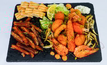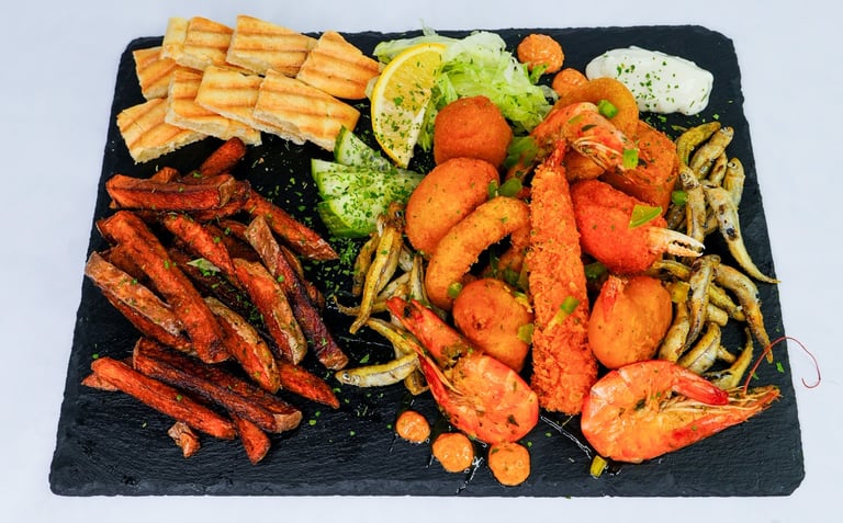 Crevettes, seiche, beignets de crevettes, croquette de crabe, calamars à la romaine, salade, patates douces ou frites, sauce aioli maison.