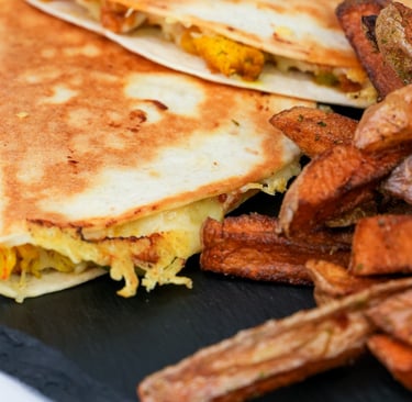 Galette de blé, poulet marine, poivrons sautés, fromage fondant, crudités, sauce au choix