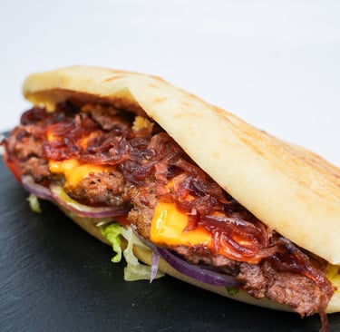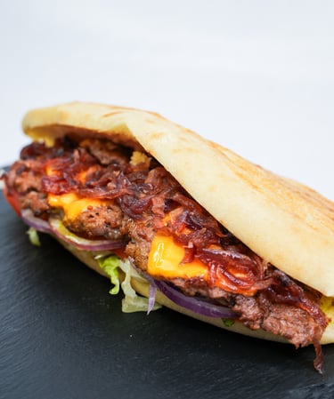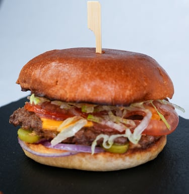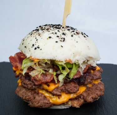Pain bao, 2 steaks smash, cheddar, oignons caramélisés, salade, double bacon, cornichon, sauce burger maison
