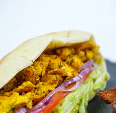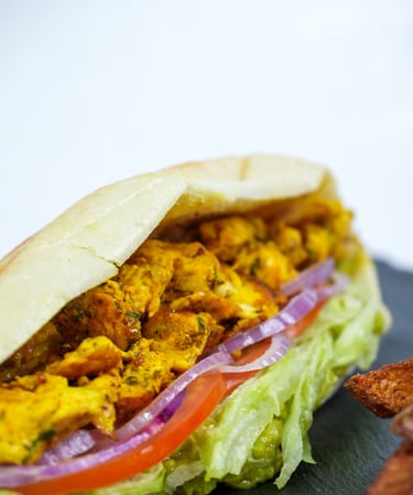 Poulet mariné, guacamole, tomates, salade, oignon rouge, sauce dynamite.