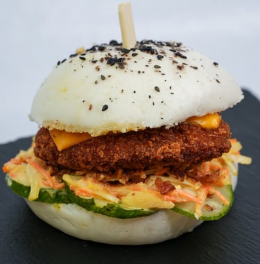 Pain bao, poulet pane façon coréenne, coleslaw, concombre, oignons frits, sauce sucrée