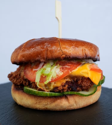 Viande hachée, cheddar, tomates, oignons caramélisés, cornichons, salade, sauce miel-moutarde