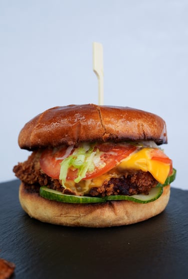 Pain brioché, poulet pané façon japonaise, cheddar, crudités, sauce miel-moutarde